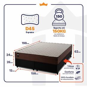 - Altura: 24 cm (colchão) + 26 cm (box) + 12 cm (pés) = 62 cm de altura;