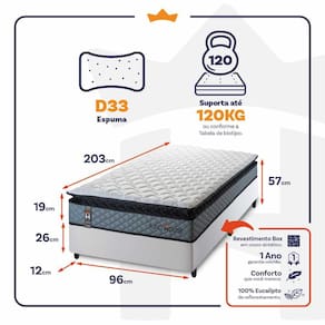 - Altura: 19 cm (colchão) + 26 cm (box) + 12 cm (pés) = 57 cm de altura;