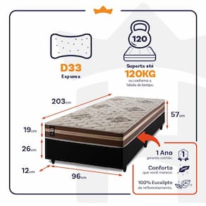 - Altura: 19 cm (colchão) + 26 cm (box) + 12 cm (pés) = 57 cm de altura;