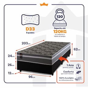 - Altura: 24 cm (colchão) + 26 cm (box) + 12 cm (pés) = 62 cm de altura;