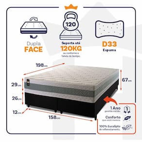 - Altura: 29 cm (colchão) + 26 cm (box) + 12 cm (pés) = 67 cm de altura;