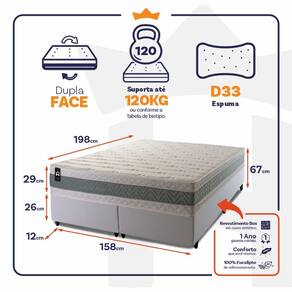 - Altura: 29 cm (colchão) + 26 cm (box) + 12 cm (pés) = 67 cm de altura;