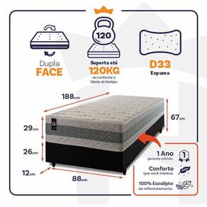 Medidas do Colchão: 88x188x29 cm, 96X203x29 cm, 128x188x29 cm,138x188x29 cm, 158x198x29 cm, 193x203x29 cm.