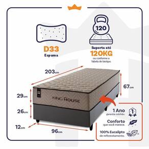 Feito com os mais nobres materiais em sua composição, ele conta com espuma D33 . O colchão King House acomoda melhor o contorno do corpo, dispondo de forma correta quadris e ombros, expulsando as dores e problemas de coluna.