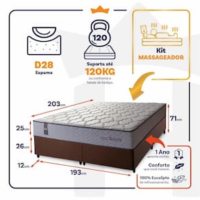 - Altura: 25 cm (colchão) + 26 cm (box) + 12 cm (pés) = 63 cm de altura.