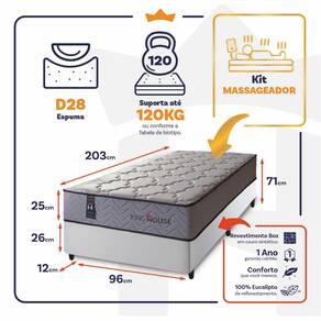 - Altura: 25 cm (colchão) + 26 cm (box) + 12 cm (pés) = 63 cm de altura.