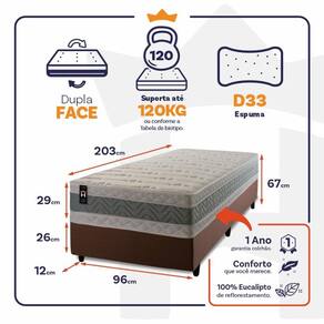 - Altura: 29 cm (colchão) + 26 cm (box) + 12 cm (pés) = 67 cm de altura;
