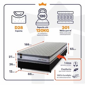 - Altura: 27 cm (colchão) + 26 cm (box) + 12 cm (pés) = 65 cm de altura;
