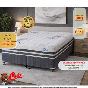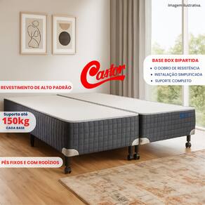 Conjunto Cama Box Queen Castor Silver Star + Colchão Tecnopedic One Face 158x198x32 com Base Bipartida O Conjunto Cama Box Queen Silver Star com Colchão Tecnopedic One Face da Castor foi desenvolvido para quem busca alto nível de conforto, resistência e sofisticação, reunindo qualidade, durabilidade e praticidade para o uso diário. O colchão conta com o exclusivo sistema de molejo Tecnopedic, que proporciona firmeza, estabilidade e excelente distribuição do peso corporal, auxiliando no alinhamento correto da coluna e garantindo noites de sono mais confortáveis. A tecnologia One Face elimina a necessidade de virar o colchão, oferecendo mais praticidade no dia a dia — basta apenas girá-lo periodicamente no sentido dos pés para a cabeceira. Seu revestimento superior matelassado de alto padrão garante toque macio, conforto superior e acabamento premium, enquanto a estrutura reforçada assegura alto desempenho e longa vida útil. A Base Box Castor Silver Star Air Bipartida complementa o conjunto com um design elegante e funcional. Revestida em suede cinza matelassado, com delicados bordados em branco, ela valoriza o ambiente e facilita o transporte e a instalação, sendo ideal para apartamentos, corredores estreitos e elevadores. Sua estrutura é produzida em madeira de Pinus e Eucatex, garantindo resistência, segurança e durabilidade. Os pés de madeira fixos e com rodízios proporcionam estabilidade e praticidade na movimentação. Como parte da linha premium da Castor, este conjunto é a escolha ideal para quem deseja unir conforto, estilo e qualidade superior, com a vantagem da base bipartida, que traz mais facilidade no dia a dia.