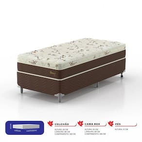 Colchão com Estrutura interna composta de molas ensacadas individualmente, Espuma poliuretano densidade 26kg/m3, EPS - Poliestireno Expandido, feltro resinado e TNT 100g. Faixa lateral e tampo no tecido sintel 100% Poliéster, fundo do produto TNT 100g ati derrapante. Cor da faixa lateral marrom, Tampo bege com estampa floral. Box com madeira pinus e eucalipito, revestido com tecido sintel cor marrom na faixa lateral, TNT 70g preto na parte de cima e na parte de baixo. Abertura para Ventilação: Não Acompanha Cama Auxiliar: Não Acompanha Colchão: Sim Altura da Base Box (Sem o Colchão): 25 Altura do Colchão (Sem a Base Box): 26 Ambiente Principal: Quarto Antiácaro: Sim Antialérgico: Sim Antifungo: Sim Cantoneiras: Sim Cor: Bege e Marrom Cor do Produto: Bege e Marrom Informações Complementares: Colchão com tecido 100% poliéster, design inovador e estampa floral, é um tecido mais resistente aos desgastes do dia a dia, pois não fura ou desfia com facilidade. Sua estrutura é composta por espuma poliuretano densidade 26kg/m2 que dá mais conforto par Itens Inclusos: 1 Colchão, 1 Box. Linha ou Coleção: Linha Manual de Montagem e Instalação: https://product-hub-prd.madeiramadeira.com.br/871082/documents/0ba724df-0e39-4ad3-9d20-6d67c174ec1a1539360manualboxsolteiro.pdf Material da Estrutura: Eucalipto Material dos Pés: Plástico Necessita Montagem: Sim Nível de Conforto: Intermediário Origem do Produto: Nacional Peso: 29.22 Pillow: Pillow Euro Possui Baú: Não Possui Pillow: Sim Precisa virar: Não Recomendações de Uso, Manutenção e Limpeza: Seguir manual de instruções. Revestimento: Poliéster Revestimento da Base Box: Acabamento com linhas poliéster Tamanho: Solteiro Tamanho de Colchão: Solteiro Tipo do Colchão: Mola