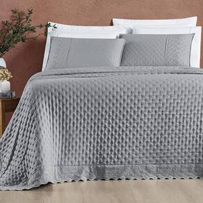 Esse conjunto inclui uma colcha de tamanho 2,60m x 2,40m, ideal para camas queen size, e dois porta travesseiros estampados de 70cm x 50cm, completando o visual elegante do seu quarto.