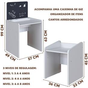 Dimensões da Mesinha com Lousa:Largura 57 cm; Profundidade 49 cm;Altura 99 cm.