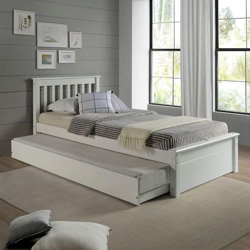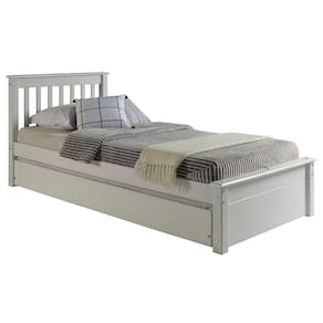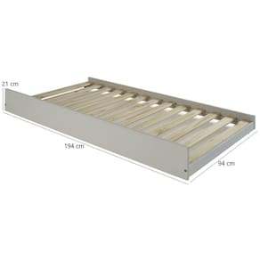 Conjunto Cama Solteiro Inglesa com Cama Auxiliar em Madeira Maciça Mv Outlet Branco - Mv Outlet Características Gerais do Produto: • Material de Composição: MDF; Madeira Maciça Pinus Reflorestada • Acabamento: Verniz / Laca • Para colchão Tam.: Padrão solteiro 188x88cm (não incluso). • Peso Suportado: 100 kg por cama. • Desmontado?: Sim