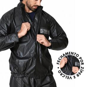 Conjunto de chuva confeccionado em PVC forrado, composto por blusão com fechamento frontal por zíper e veIcro, carcela de proteção, elástico na cintura, ajuste nos punhos por veIcro, faixa refletiva nas costas e no bolso frontal. Calça com ajuste na cintura por elástico, zíper para ajuste no tornozelo.