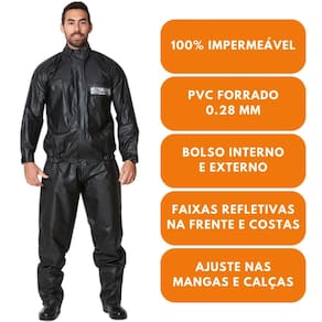 Informações técnicas Marca: Brascamp Modelo: Moto Race Faixa refletiva Bolso interno e externo Ajustes nas mangas e calças PVC forrado 0,28mm CA 28481 (Blusão) CA 28482 (Calça)