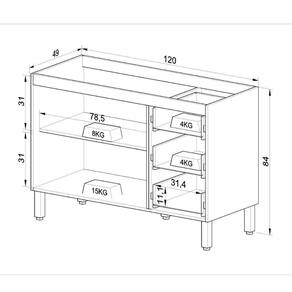 As dimensões estão expressas na seguinte forma - Largura x Altura e Profundidade em cm. O peso suportado considera a carga distribuída igualmente pela peça.
