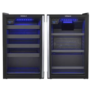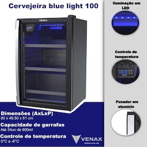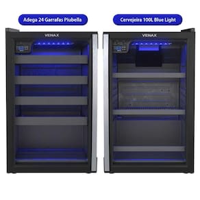 Conjunto Cervejeira 100L Blue Light + Adega 24 Garrafas Piubella com porta invertida. Cervejeira com temperatura de -6C a 0C, adega com temperatura de 6C a 20C, ambas com iluminação LED azul.Capacidade total de garrafas