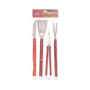 Perfeito para os churrasqueiros que preferem assar na grelha, esse Conjunto para Churrasco 4 Peças da Mor é item indispensável. Resistente, é produzido em aço inoxidável e cabo em madeira. Conta com um garfo, uma faca, uma espátula e um pegador com cabos prolongados para garantir mais segurança durante o manuseio das carnes na brasa. Possuem ainda alças na extremidade possibilitando ser pendurados na sua cozinha ou junto à churrasqueira. É a facilidade que você necessitava para completar o seu churrasco!