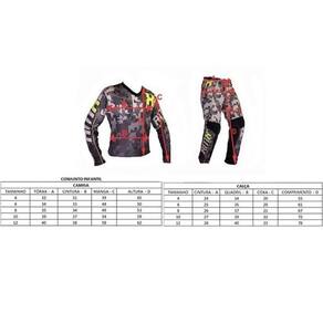 Já a calça Amx foi fabricada com tecido 100% em poliéster considerada muito resistente, conta com malha elástica no joelho e na barra, facilitando na hora de se movimentar ao colocar as joelheiras e melhor ajuste dentro das botas.