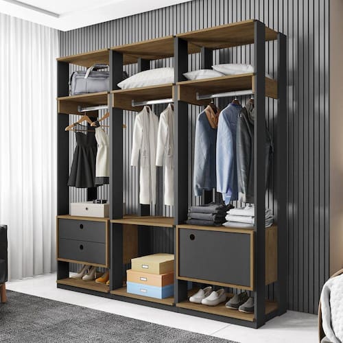 Conjunto com 3 Módulos Titan, sendo 1 Módulo c/ Porta e 1 Módulo c/ Gavetas – Preto Velluto/Freijó - Produto destinado por sua versatilidade a qualquer ambiente e espaço de sua casa. Pode ser utilizado de várias formas, Roupeiro (Closet), Livreiro, Multiuso. Sendo o produto somente de prateleiras. Prateleiras e Gavetas ou Prateleiras e Porta. Estrutura de 15mm. Acabamento da Gaveta: Pintura Texturizada UV Acabamento da Porta: Pintura Texturizada UV Acabamento da Prateleira: Pintura Texturizada UV Acabamento dos Pés: Pintura Altura dos Pés: 0.5 Ambiente Principal: Quarto Complexidade da Montagem: Alta: deve ser montado por um montador especializado Composição: MDP Cor: Preto Velluto/Freijó Cor do Produto: Preto Velluto/Freijó Cor Interna: Preto Escala de Brilho: Semi-Fosco Espessura do Material da Estrutura: 15 Gaveta com Chave: Não Informações Complementares: Suporta até 3kg por Prateleira. Itens Inclusos: 3 Módulos Titan, Kit Ferragens e Manual de Montagem Linha ou Coleção: Titan Manual de Especificação Técnica: https://cdn2.madeiramadeira.com.br/atributo/moveis-leao/998876-manual-de-montagem-conjunto-modulo-titan-porta.pdf Manual de Montagem e Instalação: https://cdn2.madeiramadeira.com.br/atributo/moveis-leao/998875-manual-de-montagem-conjunto-modulo-titan-porta.pdf Material da Gaveta: MDP Material da Porta: MDP Material da Prateleira: MDP Material dos Pés: PVC Material Principal: MDP Módulo Individual: Sim Necessita Montagem: Sim O Módulo Pode ser utilizado individualmente: Não Origem do Produto: Nacional Pés Reguláveis: Não Peso: 65.5 Peso Máximo por Gaveta: 2 Peso Máximo por Prateleira: 3 Possui Cabideiros: 03 Possui Calceiros: Não Possui Espelho: Não Possui Possui Pés: 12 Possui Portas: 01 Possui Prateleiras: 06 Possui Rodízio: Não Recomendações de Uso, Manutenção e Limpeza: Limpeza apenas com um pano úmido. Não utilizar produtos químicos ou abrasivos. Sapatas Niveladoras: Não Sistema de Montagem: https://cdn2.madeiramadeira.com.br/atributo/moveis-leao/998876-manual-de-montagem-conjunto-modulo-titan-porta.pdf Suporta Até (kg): 3 kg Tipo de Corrediça da Gaveta: Metálica Telescópica Tipo de Dobradiça/Corrediça da Porta: Metálica Tipo de Módulo: Closet Tipo de Puxador da Gaveta: Embutido Tipo de Puxador da Porta: Interno Ean: 7909903317778