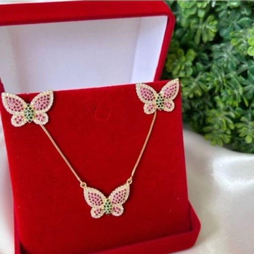 Conjunto Colar +Brinco Borboleta em Banho de Ouro 18k