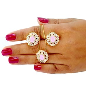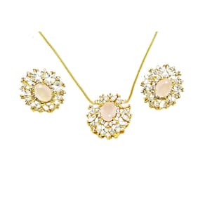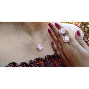 Um Belíssimo Conjunto de Colar e Brincos Folheado a Ouro 18K Com tratamento Antialérgico Com Zircônia Central na Cor Rosa Leitoso com Pequenas Navetes Cristal em Toda Sua Volta Faz Desse Conjunto Inigualável em Beleza e Sofisticação. Ideal para mulheres que amam estar sempre na moda. Os detalhes da zircônia Rosa e os Navetes Cristais dá a essa peça um toque especial de brilho e classe. Dados Técnicos: Marca: Visujóias Corrente: 44 cm Brincos e Pingente: 2 cm Diâmetro com pedra zircônia na cor Rosa no centro e em volta pedras Navetes na cor Cristais. Folheação: Ouro 18k : 6 Meses quanto a folheação e 1 ano para defeitos provenientes de fabricação. Todas as peças possuem tratamento antialérgico Marca: Visujoias