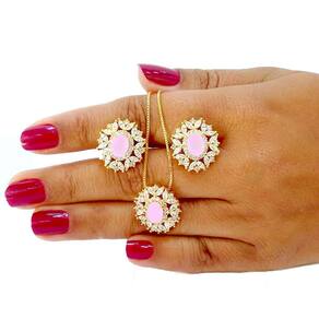 Um Belíssimo Conjunto de Colar e Brincos Folheado a Ouro 18K Com tratamento Antialérgico Com Zircônia Central na Cor Rosa Leitoso com Pequenas Navetes Cristal em Toda Sua Volta Faz Desse Conjunto Inigualável em Beleza e Sofisticação. Ideal para mulheres que amam estar sempre na moda. Os detalhes da zircônia Rosa e os Navetes Cristais dá a essa peça um toque especial de brilho e classe. Dados Técnicos: Marca: Visujóias Corrente: 44 cm Brincos e Pingente: 2 cm Diâmetro com pedra zircônia na cor Rosa no centro e em volta pedras Navetes na cor Cristais. Folheação: Ouro 18k : 6 Meses quanto a folheação e 1 ano para defeitos provenientes de fabricação. Todas as peças possuem tratamento antialérgico Marca: Não Informado