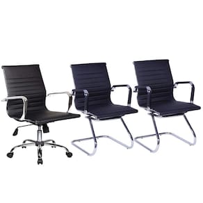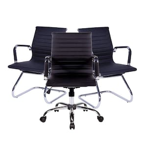 Conjunto com 1 Cadeira Diretor Giratória e 2 Cadeiras Executivas base fixa para Escritório Esteirinha Boston PretoA linha Boston são sofisticadas mobílias para compor ambientes profissionais ou particulares. Seu design é atemporal a harmoniza com qualquer espaço, além de sua beleza o conforto surpreende com recursos ergonômicos, que proporciona bem estar para quem passa longos períodos no posto de trabalho.Inspiradas no consagrado casal de designers americano, Charles e Ray Eames, a linha Boston confere elegância e design ao ambiente!ATENÇÃO:- Não nos responsabilizamos pela montagem / instalação do produto. - Imagens meramente ilustrativas.- Produto enviado desmontado acondicionado em caixa de papelão reforçada, acompanha manual de montagem.- Produto de montagem simples e rápida.A cadeira Diretor possui:- Regulagem de altura a gás- Base giratória- Rodízios plásticos- Apoio para braços- Função Relax: aumento do grau de inclinação, com regulagem e trava.A cadeira Executiva possui:- Base fixa e apoio antideslizante- Apoio para braçosDimensões da Cadeira Diretor montada (cm): 53,0 (P) x 55,0 (L) x 91,0 (A)Peso Cadeira Diretor (kg): 8,5Dimensões de cada Cadeira Executiva montada (cm): 55,0 (P) x 53,0 (L) x 91,0 (A)Peso Cadeira Executiva (kg): 8,0Garantia: 03 MesesLimpeza e Cuidados:- Base: pano levemente umedecido com água, seguido de pano seco. - Assento/encosto: escova com cerdas macias.- Não utilizar produtos químicos ou abrasivos na limpeza. - Evitar batidas e contato com objetos cortantes.