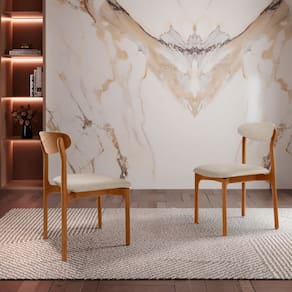 O toque final de charme rústico é encontrado nos detalhes de madeira na parte de trás dos encostos. Esses elementos adicionam uma camada de autenticidade ao conjunto, criando um contraste harmonioso com a elegância moderna das cadeiras.