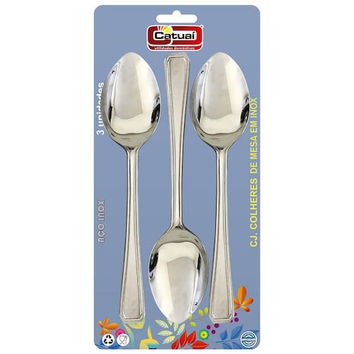 Conjunto com 3 Colheres De Mesa Em Inox Catui É ideal para quem busca talheres de alta qualidade que irão trazer mais durabilidade e mais beleza à sua mesa em qualquer ocasião. Feitos em inox , os talheres são muito resistentes e apresentam um polimento especial em alto brilho, o que resulta em um produto elegante e reluzente. Antes do uso: antes de utilizar o , remova as eventuais etiquetas. Lave-o com água quente e detergente neutro, durante a lavagem use somente esponja macia, outros tipos de produtos, como palha de aço, poderão riscar ou prejudicar o brilho dos talheres. Enxágue bem cada peça a fim de remover totalmente os resíduos dos produtos de limpeza, que por serem abrasivos, podem danificar o inox. Após a lavagem enxugue os talheres, pois as substâncias químicas contidas na água poderão causar manchas. Sempre que possível use água quente, pois renova o brilho dos talheres. Evite o contato das peças com superfícies quentes, pois podem provocar a descoloração do produto. Quando usar a máquina de lavar louça, recomendamos retirar os talheres logo que tenha terminado o ciclo enxaguar, a fim de que os mesmos sejam secados manualmente. Marca: Não Informado