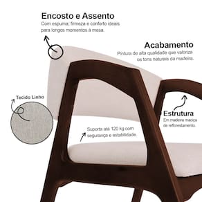 O assento com espuma de alta densidade D26 garante conforto prolongado, enquanto o encosto estofado com espuma D20 proporciona apoio suave e ergonômico. Revestida em tecidos nobres, a cadeira alia maciez e durabilidade, adaptando-se com facilidade a diferentes estilos de decoração.