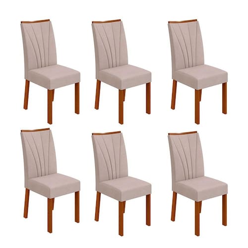 Que tal o Conjunto com 6 Cadeiras Apogeu? Sua sala de jantar dos sonhos está a um Conjunto Apogeu de distância! Com 6 cadeiras, o kit tem o bem-estar perfeito para o dia a dia, graças ao assento e ao encosto estofados em espuma e revestidos em tecido de toque agradável - a estrutura clássica ainda ajuda na receptividade, pois recebe bem o corpo. Por falar em clássico, a cor neutra e o amadeirado se unem num combo primoroso para encher de sofisticação sua casa - notou o detalhe na parte superior do encosto? Além de embelezar o ambiente, ele auxilia a puxar e recolher as cadeiras ;) Marca: Não Informado