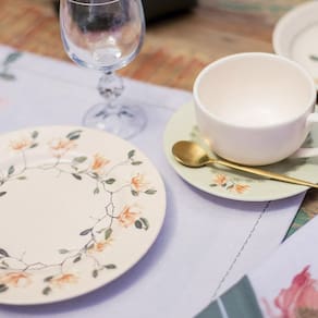 Contendo 6 pratos de sobremesa com 29 cm de diâmetro.