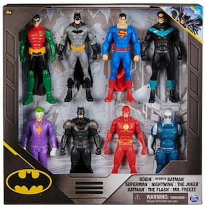 Escolha entre o cavaleiro das trevas Batman, o garoto prodigio Robin, o homen de aço Superman, o defensor de bludhaven Asa Noturna, o velocista escarlate Flash e até mesmo vilões como Sr. Frio e o palhaço principe do caos Coringa!