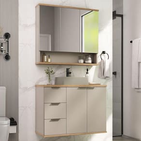 O conjunto perfeito para quem deseja unir estilo, praticidade e conforto no banheiro. Produzido em MDF de 18mm com fita de borda em PVC, ele combina design moderno e resistência para o seu dia a dia. O gabinete com fechamento suave nas portas traz praticidade e conforto, enquanto a espelheira com nichos organizadores garante mais espaço e elegância para o ambiente. Uma escolha completa para deixar seu banheiro lindo, organizado e funcional.