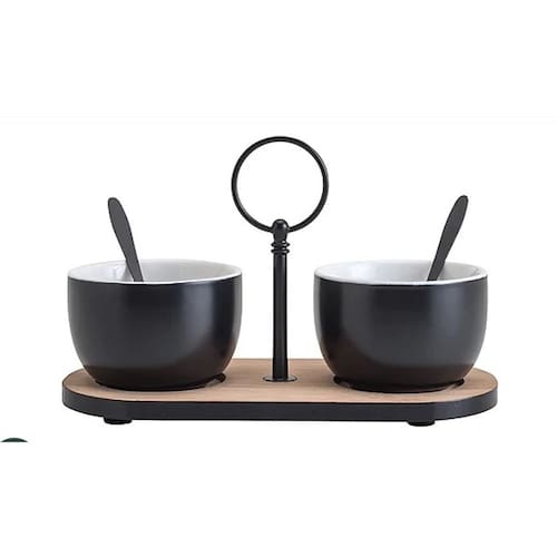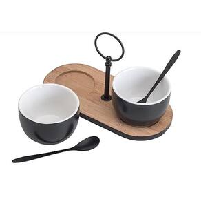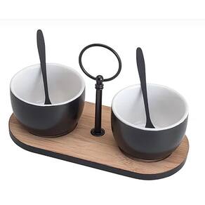Conjunto com bandeja de bambu com molheiras e duas colheres.