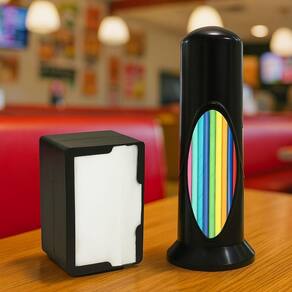 O porta guardanapo é compatível com papel modelo TV 13x14, permitindo reposição rápida e mantendo sempre a mesa ou balcão organizado. Já o porta canudo oferece praticidade para clientes e colaboradores, mantendo os utensílios sempre à mão de forma higienizada.