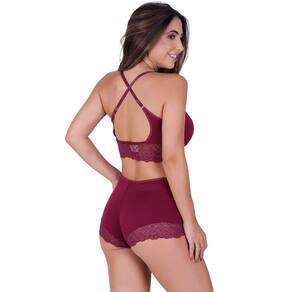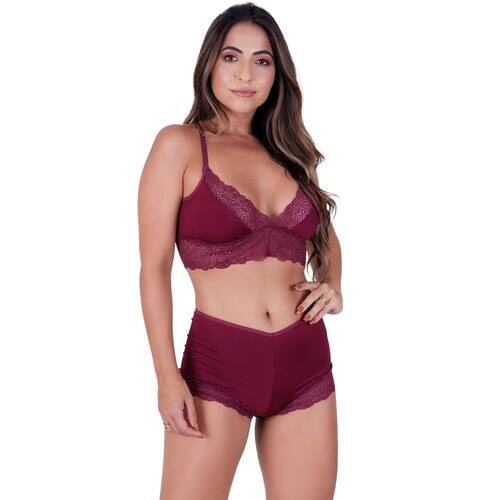 O conforto e a delicadeza que toda mulher merece! Sutiã sem bojo e sem arco em tecido e renda de poliamida em parte do busto em toda a pala, sua elasticidade facilita vestir a peça já que não tem abertura. As alças com regulagem de altura em metal são cruzadas no pescoço, ideal para usar com blusas ou vestidos de costas seminuas. Calcinha estilo caleçon em tecido e renda de poliamida nas barras das pernas e viés na cintura.