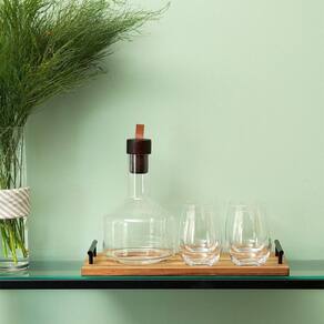 Conjunto Copa E Cia Bandeja E Jarra Com 4 Copos Conjunto Copa e Cia Bandeja e Jarra com 4 Copos - Características Gerais do Produto: - Composição: Composto por Cristal Ecológico/Madeira Acácia. - Detalhes: Design Exclusivo Copa&Cia.; As cores podem sofrer pequenas alterações de cor, variando de monitor para monitor.; Os objetos que ambientam as fotos não acompanham o produto.; As fotos produzidas são apenas como sugestão de uso com as demais peças da coleção.; Kit acompanha: Bandeja, Jarra e 4 Copos. - Cuidados: Armazenar em local seco e arejado.; Não podem ser colocados em lava-louças.; Evitar contato com objetos cortantes ou superaquecidos.; Não utilizar solventes, abrasivos ou alvejantes.; Não utilize líquidos quentes.; Secagem natural para evitar manchas.; Limpar com água morna, detergente neutro e esponja macia.; Não podem ser introduzidos em micro-ondas e forno. - Dimensões (cm): Capacidade da Jarra para 1800 ml e Copo 550 ml.; Bandeja 42 X 20,8 cm Acompanha o produto: - 1 Peça de Bandeja1 Peça de Jarra/Moringa4 Peças de Copos Garantia: - 7 dias/30 dias contra defeito de fabricação