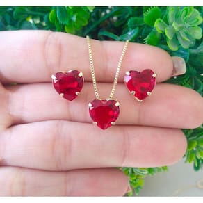 Conjunto Coração Vermelho Banhado A OuroTamanho padrão da corrente: 45cmTamanho do Pingente de Coração: Altura 1cm - Comprimento 1,1cm - Espessura 0,60mmPeso: 6,1gJhulias joias e semi-joias:- acompanha embalagem para presentear- acompanha certificado de garantiaFicha técnica- Cor: Vermelho