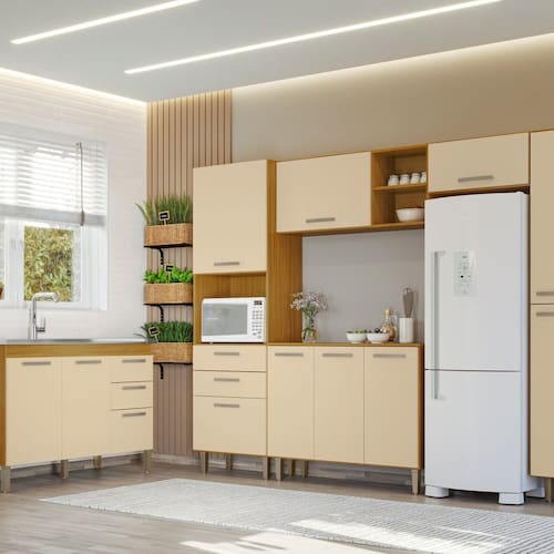 Transforme o coração da sua casa com a Cozinha Modulada Iris de 5 peças, a solução definitiva para quem busca sofisticação e funcionalidade em um só lugar. Desenvolvida com estrutura robusta em MDP de 1,2cm e 1,5cm, este conjunto oferece a durabilidade necessária para o uso cotidiano intenso. As corrediças telescópicas garantem uma abertura suave e silenciosa das gavetas, enquanto os puxadores em PVC agregam um toque moderno ao design clean. O amplo balcão de 118cm para pia (sem tampo) proporciona o espaço ideal para organizar seus utensílios e preparar refeições com total praticidade. Sua estrutura modular permite uma adaptação inteligente ao seu ambiente, otimizando cada centímetro disponível sem abrir mão da elegância. Com altura de 205cm e largura total de 265cm, ela preenche o espaço de forma harmônica e organizada. Garanta agora a sua Cozinha Iris e eleve o nível de organização e beleza da sua casa. Acabamento da Prateleira: Pintura Texturizada UV Escala de Brilho da Prateleira: Semi-Fosco Acabamento da Gaveta: Pintura Texturizada UV Escala de Brilho da Gaveta: Semi-Fosco Material do Puxador da Gaveta: PVC Acabamento da Porta: Pintura Texturizada UV Escala de Brilho da Porta: Semi-Fosco Material do Puxador da Porta: PVC Acabamento dos Pés: Pintura Acompanha Rodapé Decorativo: Não Acompanha Tampo: Não Altura dos Pés: 10 cm Altura Máxima dos Pés: 10.0000 Ambiente Principal: Cozinha Balcão Suporta Pia: Sim codigo_ean: 7900288336132 Complexidade da Montagem: Alta: deve ser montado por um montador especializado Cor: Carvalho Americano/Off White Cor do Produto: Carvalho Americano/Off White Cor Interna: Carvalho Americano Escala de Brilho: Semi-Fosco Espessura do Material da Estrutura: 12 mm Gaveta com Chave: Não Informações Complementares: Cozinha Completa Modular Itens Inclusos: 1 Cozinha Completa, Kit Ferragem e Manual de Montagem Linha ou Coleção: Íris Manual de Especificação Técnica: https://product-hub-prd.madeiramadeira.com.br/538427600/documents/a304501a-93cb-48f5-bb8f-5920d093deb63388411673617709029994024.pdf Manual de Montagem e Instalação: https://product-hub-prd.madeiramadeira.com.br/538427600/documents/371849ca-f029-4752-b35e-79dbe253fcae3388410673617709029833656.pdf Marca: Incorplac Material da Corrediça: Metálica Material da Dobradiça/Corrediça da Porta: Metálica Material da Gaveta: MDP Material da Porta: MDP Material da Prateleira: MDP Material do Fundo: MDP Material dos Pés: PVC Medida de cada item (A x L x P): COZINHA 205x265x28 BALCÃO 84x118x50 modular: Sim Montagem Flex: Sim Necessita Montagem: Sim O Balcão Acompanha Pia: Não Origem do Produto: Nacional Pés Reguláveis: Não Peso: 122 kg Peso Máximo por Gaveta: 5 kg Peso Máximo por Prateleira: 5 kg Possui Pés: 10 Possui Portas: Sim Possui Prateleiras: Sim Possui recorte para Cooktop: Não Possui Rodízio: Não Possui Vidro: Não Produto Montado: Sim Recomendações de Uso, Manutenção e Limpeza: Evite exposição direta ao sol, calor ou umidade excessiva. Limpe apenas com pano macio e levemente umedecido; não use produtos abrasivos, álcool ou solventes. Mantenha os móveis nivelados para evitar empenamento. Não sobrecarregue prateleiras, gavetas ou tampos com peso acima do indicado. Proteja superfícies contra objetos quentes, pontiagudos ou molhados. Evite arrastar os móveis; levante-os para movimentar. Realize a montagem com profissional qualificado e siga o manual de instruções. Em caso de contato com líquidos, seque imediatamente para evitar danos permanentes. Sapatas Niveladoras: Sim Sistema de Montagem: Acompanha Suporta Até (kg): 50 kg Tamanho Indicado da Pia: 120cm Tamanho Indicado do Tampo: 120cm Tipo de Corrediça da Gaveta: Metálica Telescópica Tipo de Dobradiça da Porta: Simples Tipo de Puxador da Gaveta: Externo Tipo de Puxador da Porta: Externo Marca: Não Informado