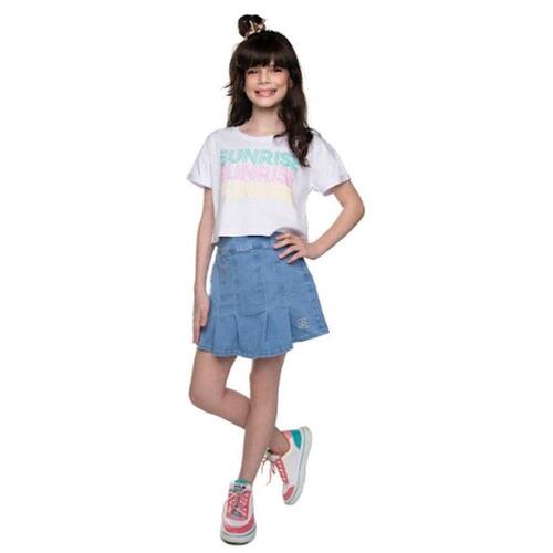 Conjunto croped meia manga sunrise, saia jeans com pregas Have Fun