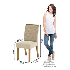 FICHA TÉCNICA: Escala de Brilho Cadeiras: Fosco Cadeiras Possui Rodízio: Não Peso Suportado por Cadeira: 120 Kg Estrutura Assento: MDP/MDF Altura Assento até o chão: 45,5 Cm Revestimento Assento: Tecido Suede Enchimento Assento: Espuma D18 Almofada Assento: Não possui Tipo Assento: Fixo Estrutura Encosto: MDP/MDF Revestimento Encosto: Tecido Suede Enchimento Encosto: Espuma D18 Tipo Encosto: Fixo Material dos pés: MDF Medidas Montado: 95,5 x 44 x 55,5 Cm Peso Montado: 7,5 Kg