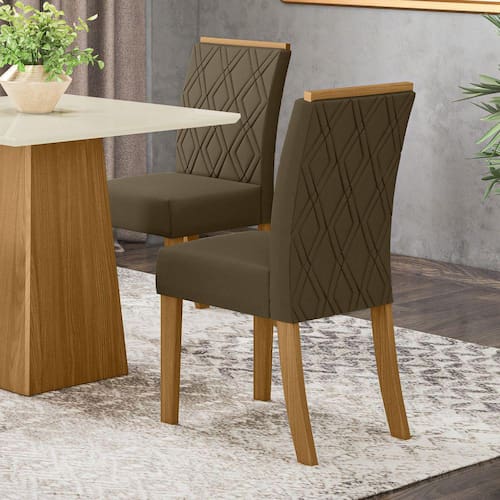 FICHA TÉCNICA: Escala de Brilho Cadeiras: Fosco Cadeiras Possui Rodízio: Não Peso Suportado por Cadeira: 120 Kg Estrutura Assento: MDP/MDF Altura Assento até o chão: 45,5 Cm Revestimento Assento: Tecido Suede Enchimento Assento: Espuma D18 Almofada Assento: Não possui Tipo Assento: Fixo Estrutura Encosto: MDP/MDF Revestimento Encosto: Tecido Suede Enchimento Encosto: Espuma D18 Tipo Encosto: Fixo Material dos pés: MDF Medidas Montado: 95,5 x 44 x 55,5 Cm Peso Montado: 7,5 Kg