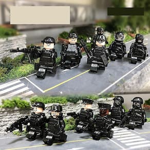 PRODUTO INTERNACIONAL - Conjunto com 12 Mini Figuras de Policiais SWAT Pretos em Blocos de Montar. A cor enviada será baseada na imagem principal da página do produto. Essas figuras são personalizadas e feitas de plástico ABS, totalmente seguro para crianças. Compatível com todos os principais blocos de construção.