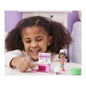 Cozinhe uma obra-prima culinária com Gabby e o Almoço da Casa de Bonecas da Gabby e Munch Set! Este divertido conjunto de brinquedos inclui uma figura colecionável Gabby Girl de 4" polegadas, figura cakey cat, um pedaço de móveis de pia de cozinha, além de uma caixa de entrega dollhouse com um acessório de cozinha surpresa dentro! Assim como Gabby faz no show, unbox sua entrega especial Dollhouse e descobrir o acessório misterioso do conjunto. O que você vai encontrar lá dentro? Após a revelação, use sua imaginação para jogar suas próprias aventuras culinárias com Gabby e Cakey Cat! Pressione as orelhas de gato da Gabby para virar a frigideira para fingir diversão de cozinha e ajudá-la a ser criativa na cozinha. É tão divertido! Então, ajude Gabby a lavar pratos na pia e descobrir os armários de cozinha de trabalho – eles realmente abrem e fecham! Este brinquedo infantil é o presente perfeito para crianças de 3 anos e pode ser com a Boneca Purrfect da Gabby (vendida separadamente). Descubra mais possibilidades de contar histórias com todos os Conjuntos de Dollhouse da Gabby, incluindo o Flower-rific Garden, Kitty Karaoke e o Art Studio (cada um vendido separadamente)! Para uma última surpresa, escaneie o código QR dentro do Dollhouse Delivery para desbloquear uma recompensa especial no aplicativo Gabby's Dollhouse (disponível para iOS e Android). Traga para casa o Lunch and Munch Set e junte-se a Gabby da série da NETFLIX, Gabby's Dollhouse, para se divertir na cozinha!