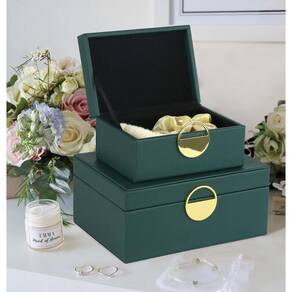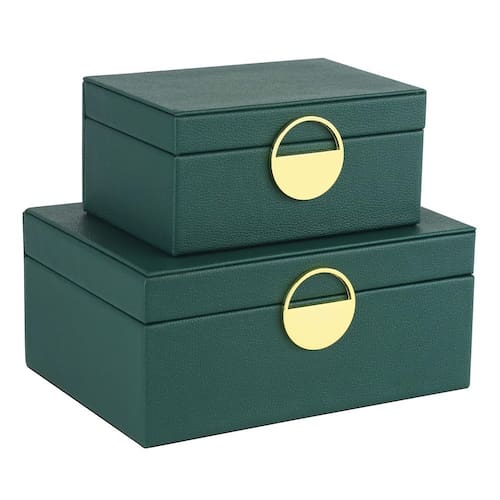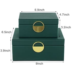 HofferRuffer Caixas de joias de couro sintético, organizador de acessórios de armazenamento de caixas decorativas com decoração de ferragens douradas, couro vegano clássico, conjunto de 2 peças - Lindas caixas são muito bem feitas à mão, estrutura de madeira coberta com couro sintético preto de alta qualidade, forrada com veludo macio, mantém seus itens favoritos longe de arranhões e poeira. - As caixas de armazenamento de joias feitas à mão são ótimas para liberar espaço na cômoda. Guarde seus colares, anéis, pulseiras, relógios, óculos de sol e outros objetos de valor em um local seguro. - Uma maneira elegante de armazenar os itens necessários, esconder a bagunça em qualquer lugar da casa, usando essas caixas na sua mesa de entrada para guardar luvas, chaves de carteira e controles remotos! - Conjunto de 2 caixas de armazenamento, perfeitas para armazenar fotos de medicamentos e outros objetos, você pode usá-las separadamente. Também tem um toque sofisticado de elegância para o seu quarto. - Caixas úteis para fins decorativos e fazem um excelente trabalho, funcional e decorativo, decoração muito glamorosa. Conjunto de 2 caixas encaixadas: G: 28 x 16,5 x 10,5 cm P: 20,6 x 12,6 x 8 cm.
