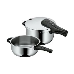 Este conjunto de panelas de pressão da WMF é composto por duas panelas, sendo uma de 4,5 litros e a outra de 3 litros, e uma tampa que se encaixa em ambas as panelas. Este conjunto é ideal para preparar feijão, carnes, legumes ou até mesmo fazer sopas, podendo escolher a melhor capacidade de acordo com a sua necessidade. Possui o exclusivo sistema composto por 5 válvulas e trava no cabo que garantem maior segurança.Produzida em aço inox Cromargan, material exclusivo da marca, que oferece maior resistência a riscos, mesmo após o uso prolongado, além de durabilidade e facilidade para higienizar. Ainda conta com sistema de funcionamento silencioso, e tecnologia Transtherm, que proporciona melhor distribuição de calor, reduzindo o tempo de preparo em até 70%. Projetada para utilizar em todos os tipos de fogões, incluindo indução.Ficha técnica:- Código: 4080011412- Marca: WMF- Conteúdo da Embalagem: 2 Panelas-Especificações do produto:Pode ser utilizado em todas as fontes de calor, incluindo a indução- Material: Aço inox- Capacidade: 1 Panela de 4,5 litros e 1 panela de 3 litros- Peso: 5,277kg- Dimensões: 26cm x 27cm x 41,5m (AxLxP)- Garantia: 5 Anos