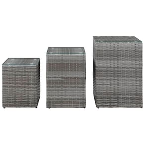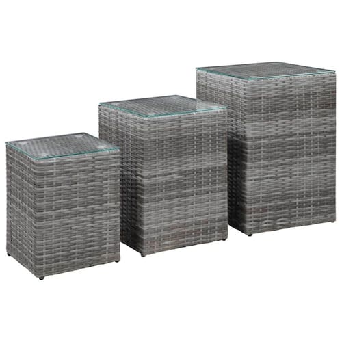 Este conjunto de três mesas laterais é uma opção inteligente e moderna para sua sala de estar, seja na sala de estar ou na varanda. Feitas de poliéster cinza com tampos de vidro transparente, essas mesas combinam funcionalidade com design moderno, ótimas para servir café, segurar luminárias ou exibir peças decorativas