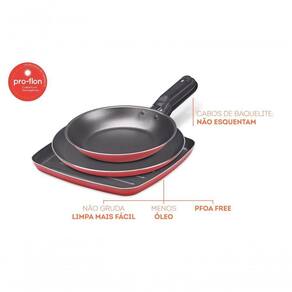 Para acompanhar as suas necessidades, a linha Garlic disponibiliza o conjunto de frigideira, panquequeira com grill,três peças. A estrutura de alumínio dissipa melhor o calor cozinhando o alimento por igual e mais rapidamente. Já o revestimento interno antiaderente evita que o alimento grude mesmo com uso reduzido de óleo. O material também facilita a limpeza. Sua segurança está garantida com o cabo de baquelite que não aquece. A dupla está disponível na cor vermelho. O ciclo de vida do produto pode variar conforme frequência e intensidade da utilização. O produto deve ser descartado (livre de materiais orgânicos) em coletores de resíduos seletivos. A logística reversa não é aplicável.Certificação compulsória certificada pelo OCP 0070, registro 000887/2021 e classificação de antiaderência A (ótima), conforme Portaria Inmetro 499/2021.